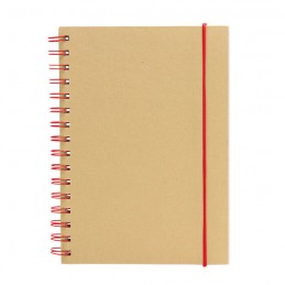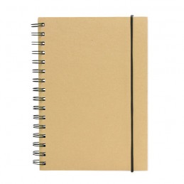 Libreta espiralada. Tapa recubierta en papel kraft de 120 g. Interior de 70 hojas blancas rayadas de 80 g. Cierre con banda elástica y espiral del mismo color.