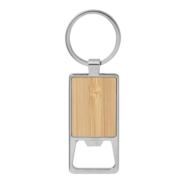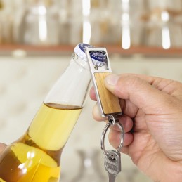 Llavero con destapador abre botellas. Estructura metálica con aleación de zinc con acabado brillante y panel frontal de bambú barnizado. 6 x 3,2 x 3,5 cm